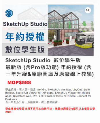 SketchUp Studio 數位學生版 最新版 (含Pro版功能) 年約授權 (含一年升級&原廠圖庫及原廠線上教學)