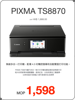 PIXMA TS8870纖巧多合一相片打印機為緊貼潮流並熱愛打印相片的用家帶來優質體驗,提供紅色、白色和黑色三種選擇,以時尚設計完美融入現代家居的生活美學