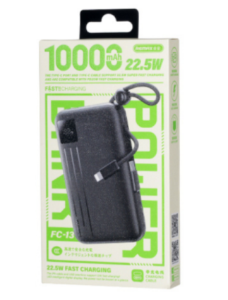 Stay Powered Up On-The-Go: REMAX FC-13 10000mAh 22.5W Fast Charging Power Bank with Dual Cable - Black