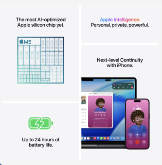 ·   SUPERCHARGED BY M5—Along with its faster CPU and unified memory, M5 features a more powerful GPU with a Neural Accelerator built into each core, delivering faster AI performance. So you can blaze through demanding workloads at mind-bending speeds.