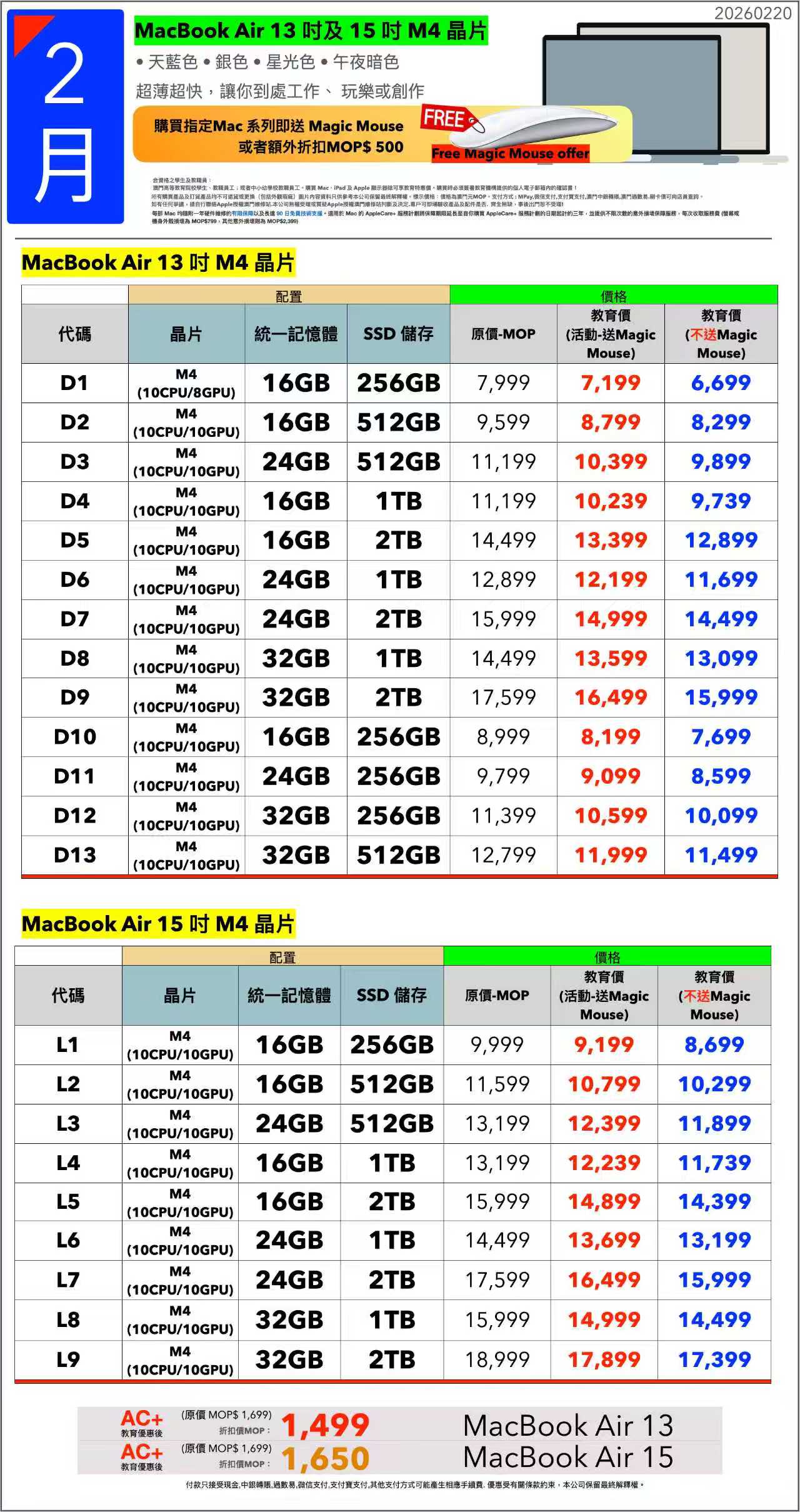 1)限時活動期間,買 指定型號Mac 可享教育優惠,贈送Magic Mouse 1只