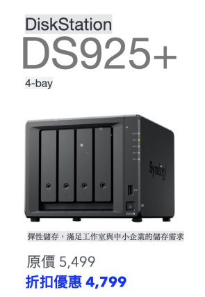 (AMD Ryzen V1500B Quad Core 2.2 GHz, 4GB DDR4 RAM ( Expanable up to 32GB ), 2 x 2.5GbE, 2 x USB 3.1) 最大支援容量:180TB 可裝置硬碟數量:4 硬碟介面:3.5/2.5吋 SATA, M.2 2280 NVMe SSD 外部連接埠:RJ-45 USB 裝置支援:USB Type-C, USB 3.2 Gen 1